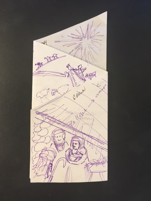 It began with a humble piece of paper and a purple Pilot pen. I chose the characters necessary to portray my themes: the Holy family, shepherds, traveling wise men, rainbow, light in darkness, palm branches and a donkey, a trumpeting angel. I suppose I could have crammed in more, but with these, I was satisfied.
